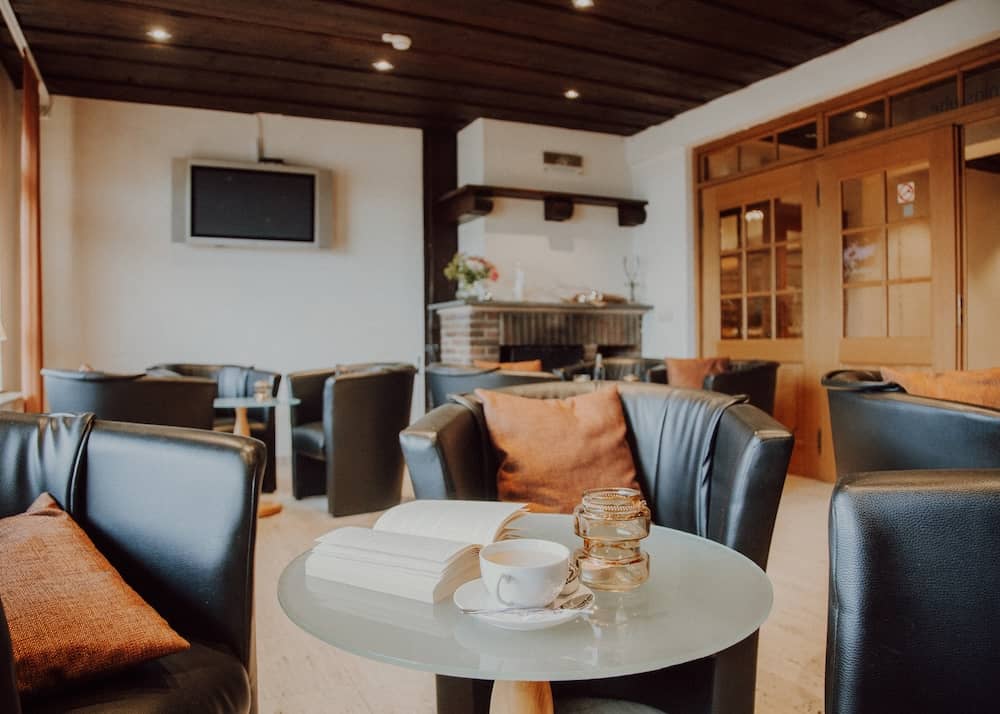 Nachmittags werden im Panorama-Café mit weitem Blick über die Landschaft Kaffee und Kuchen serviert. Abends könnt ihr im Restaurant essen oder an der Bar den Tag ausklingen lassen.